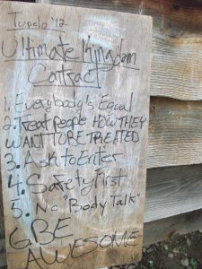 Opening day has never been smoother. I was delighted with the way TL staff immediately engaged with families and got camp off to a happy and stress-free start. Within a few hours, campers here were making friends, playing games and running around. By the evening, even the youngest could lead the way to their cabin for their first campfire, s’mores and a cabin contract. The cabin contract front-loads how campers agree to live together and respect each other. I have taken a few photos of these. Before the quiet bell, the counselors tapped into a bit of boy energy and letting the first day end with some loud positivity (basically, a lot of happy yelling!).