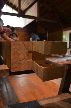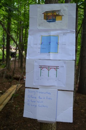 During the week, our campers and staff have been focused crafting the joinery for the frame. As our Saturday project commenced, we carried these beautiful timbers (harvested on our land) down to the cabin site. We assembled the giant pieces and joined them together with wooden pegs. Next, we raised the frame with many hands and ropes. By the end of the day, we had the framing together — including rafters. It’s a beautiful frame that we’ll spend the rest of the summer siding and roofing (as well as adding creative finishing touches).