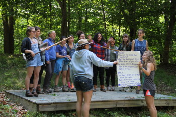 Big Lodge, made up of several cabins with 11- to 12 –year –old campers, invited others to a Lodge Night and shared about fun things to do at camp. Each camper was given a sheet of paper with a heart on it and asked to write their goals for the summer inside the heart. Some favorites included playing pranks, going to the adventure course, trying new foods, learning to dive, making friendship bracelets and playing with the farm animals. After writing down their goals, campers walked around the room, sharing with one another and signing their names the paper of others who had a common goal. Many campers were excited afterwards about all of the activities that they could do here at camp and inspired by the network of friends they have to remind them to pursue the things that they love.