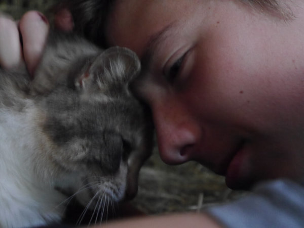 For those of you who have spent any time at the farm over the last 10 years, you know that our barn cat Burton has been an active and major part of the farm. She was caught in a trap at the Indian Brook waterfront 10 years ago and has been managing the farm, supervising all that goes on ever since. She always made her demands clear and never took “no” for an answer. She was a frequently seen riding on Adam’s shoulders parrot style and would search for him yowling when he dared to take a vacation – or parental leave. She had been spending her days in the office, mostly sitting in the sun, or behind Adam (she’s been aging quickly). She was great the kids despite having bad asthma, she let them pick her up (until she had had enough) and she guarded the dairy barn with ferocity – not necessarily against rodents (although made a show of killing a chipmunk for some of our retreat groups this fall to my utter shock) – she was sure to know who was coming and going and who would give her milk and treats the fastest.