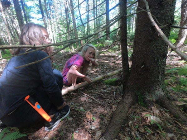 The Coyotes, the 13-14 year-olds, have also been working hard. They have been learning how to build debris shelters, which are insulating shelters made out of sticks and leaves and lined with a fir bough “mattress” (which is not only comfy, but also smells amazing!). They have already selected their special spots (which are in a ring in the woods surrounding our blueberry field) where they will spend all 24-hours alone. Another part of their challenge is to reflect on the following questions: