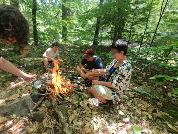 A session at Red Spruce Grove goes through different phases. First, there’s getting to know each other and the space we’re sharing. Then, there’s getting excited and inspired through learning the basic skills of camp like fire-making, cooking, and knife safety; meeting and visiting other camps, and sharing ourselves through our Interdependence Day song. After that comes a solid week of skill-building and preparation for the Red Spruce Grove capstone project: 24-hour solos! Every camper at RSG goes on a solo, whether it’s the group solo (the Lynxes) for 11-12 year-olds, or the alone solo (the Coyotes). Both groups have been working hard to get ready for their trips.
