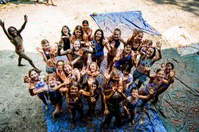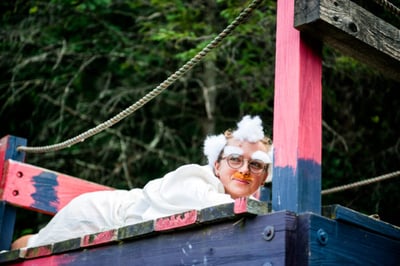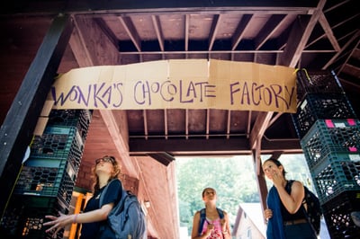 This year’s “Someday” theme was “Wonka’s Chocolate Factory”, and all campers woke to golden tickets being delivered to their cabins. The day unfolded with a sugary cereal breakfast, recorded music during singing time, and goats interrupting silent meeting. The morning held activities such as bubble baths in the bed of our pickup truck, hosting a lemonade stand on the road, a chocolate pudding rainstorm and mud pit wrestling. During rest hour, “Mike TV”, one of the characters in Willy Wonka, insisted we watch TV. In the afternoon, we all had a blast at the Oompa Loompa Pool Party, where mermaids pulled campers around on kayaks, tea was served on rafts and campers could zoom down a giant slip-and-slide. Finally, we had a concert from new local celebrity “Kitty Kat Death Wish” (one of our staff), with an autograph session afterwards, and burgers and fries for dinner.