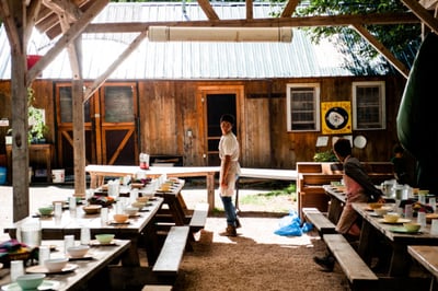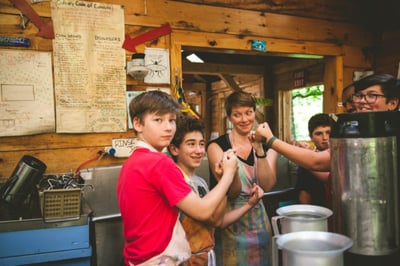 From the back of the kitchen looking north, I’m gazing over our long metal prep tables – a blur of ingredients and busy hands. The last week of this second session involves frequent visits by campers who help prepare the breads and spreads that we will serve to friends and family at Fair. The campers are chopping scallions and chives to add to butter and cream cheese, measuring dry ingredients and mixing breads. Soon enough, the bread will be baking in the ovens, and I’ll have a lovely aroma to enjoy as I work. As I look past the campers, I see the double doors of the kitchen, flying open-and-closed as campers run to gather more herbs from the garden. Past them, I can catch a glimpse of our pony kegs of SAM Dew. We filled them a week ago now, since they need time to sit in the shade of the food shelter and naturally carbonate (shout out to our good friend and microorganism, Saccharomyces cerevisiae!).