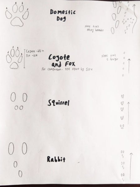 Pay attention not just to the shape of the footprints, but what the trail looks like as well. For example, the prints of your dog look pretty similar to that of a coyote. But while dogs always know when their next meal is coming, coyotes need to save their energy. And so, dog tracks often loop and meander as the dog sniffs around, while coyote tracks are straight and purposeful.