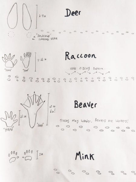 Next, go outside and find some tracks to follow. Muddy areas like riverbanks or marshes are great, but even a dirt path on a wet day can be a goldmine. If you get snow where you live, even better. Once you find some tracks, take a picture and see if you can match your tracks against ones in a field guide or on the internet (the internet is an incredible resource for tracking!). As you become familiar with these tracks, you’ll start to recognize them more and more when you go out, and you might even start noticing patterns in behavior.