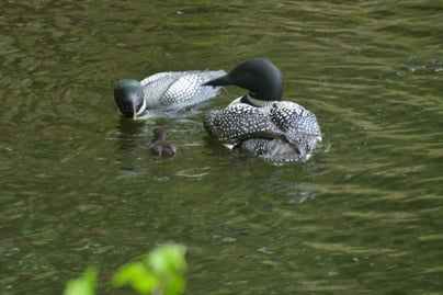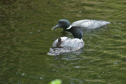 I was in my office on Wednesday afternoon and heard a shriek from the loons who were nesting not far away. They are typically quiet when nesting unless disturbed. I thought I might have to go warn someone to stay away but I happened to grab the camera with the telephoto lens, just in case. When I arrived at the site I saw the pair with the chick resting on its mother’s back! I was able to get a couple of photos and notified Dorina and Kelly, our Conservation Director, straight away.